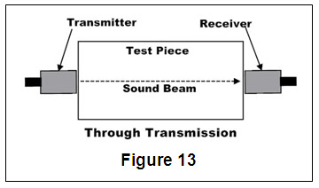 Through transmission inspections are performed using two transducers, one on each side of the part as shown in Figure 13. The transmitting transducer sends sound through the part and the receiving transducer receives the sound. Reflectors in the part will cause a reduction in the amount of sound reaching the receiver so that the screen presentation will show a signal with a lower amplitude (screen height).