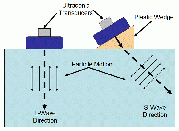 Two predominant types of waves, or wave modes, are generated within a material with ultrasonic waves: longitudinal and shear. Longitudinal waves (L-waves) compress and decompress the material in the direction of motion, much like sound waves in air. Shear waves (S-waves) vibrate particles at right angles compared to the motion of the ultrasonic wave. The velocity of shear waves through a material is approximately half that of the longitudinal waves. The angle in which the ultrasonic wave enters the material determines whether longitudinal, shear, or both waves are produced.