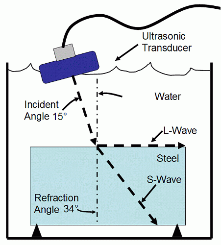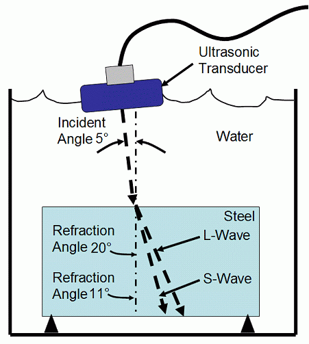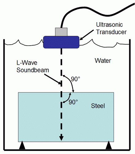 Ultrasonic beam refraction and mode conversion are comparable to light as it passes from one medium to another. Remember how the straw in the glass of water looks broken if observed from the side? The same phenomenon occurs with ultrasonic waves as they are passed into a UUT. The figure below depicts an ultrasonic transducer that transmits an ultrasonic wave through water into a block of steel. Because the direction of the ultrasonic wave is at a 90-degree angle with the surface of the steel block, no refraction occurs and the L-wave is preserved.